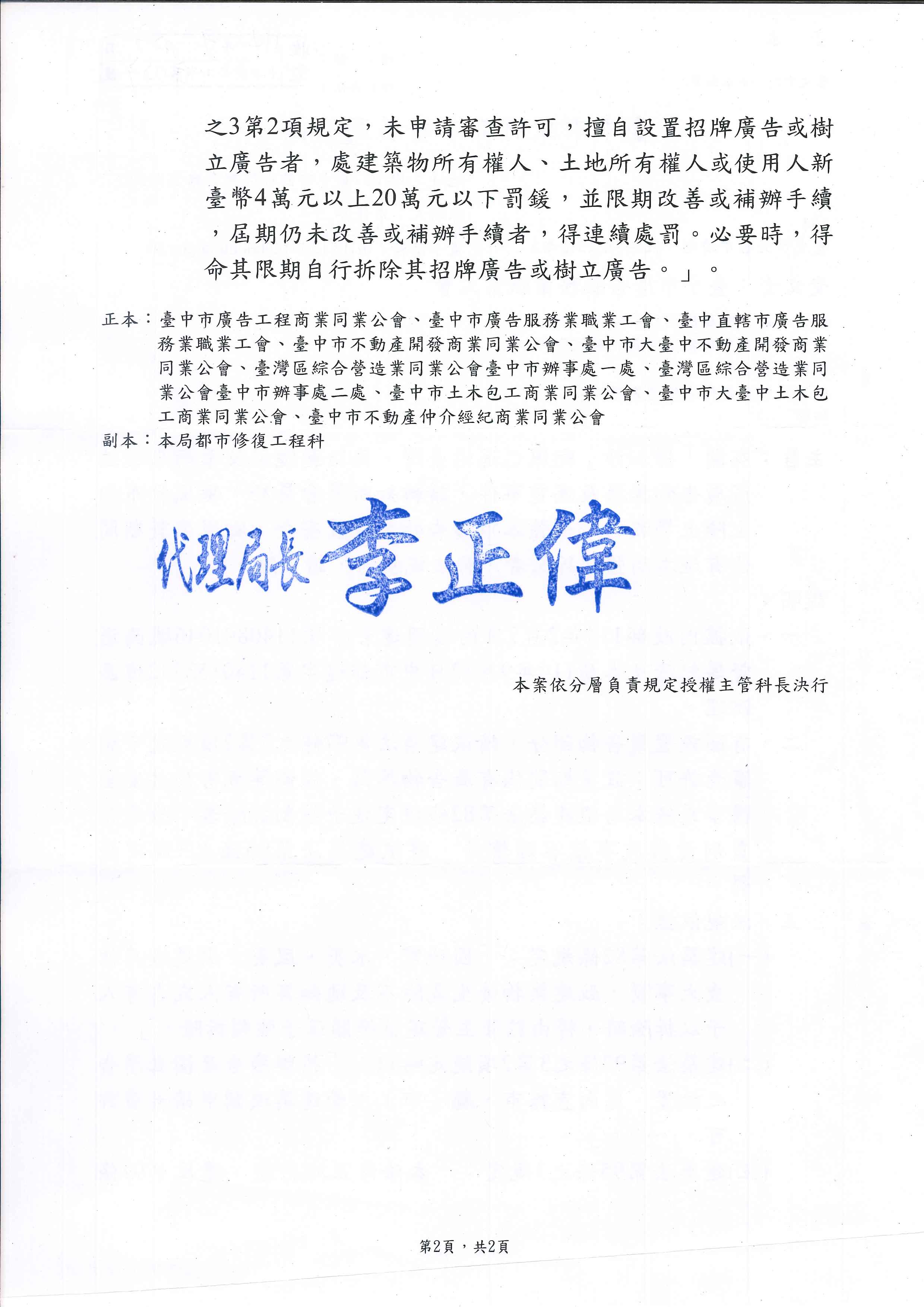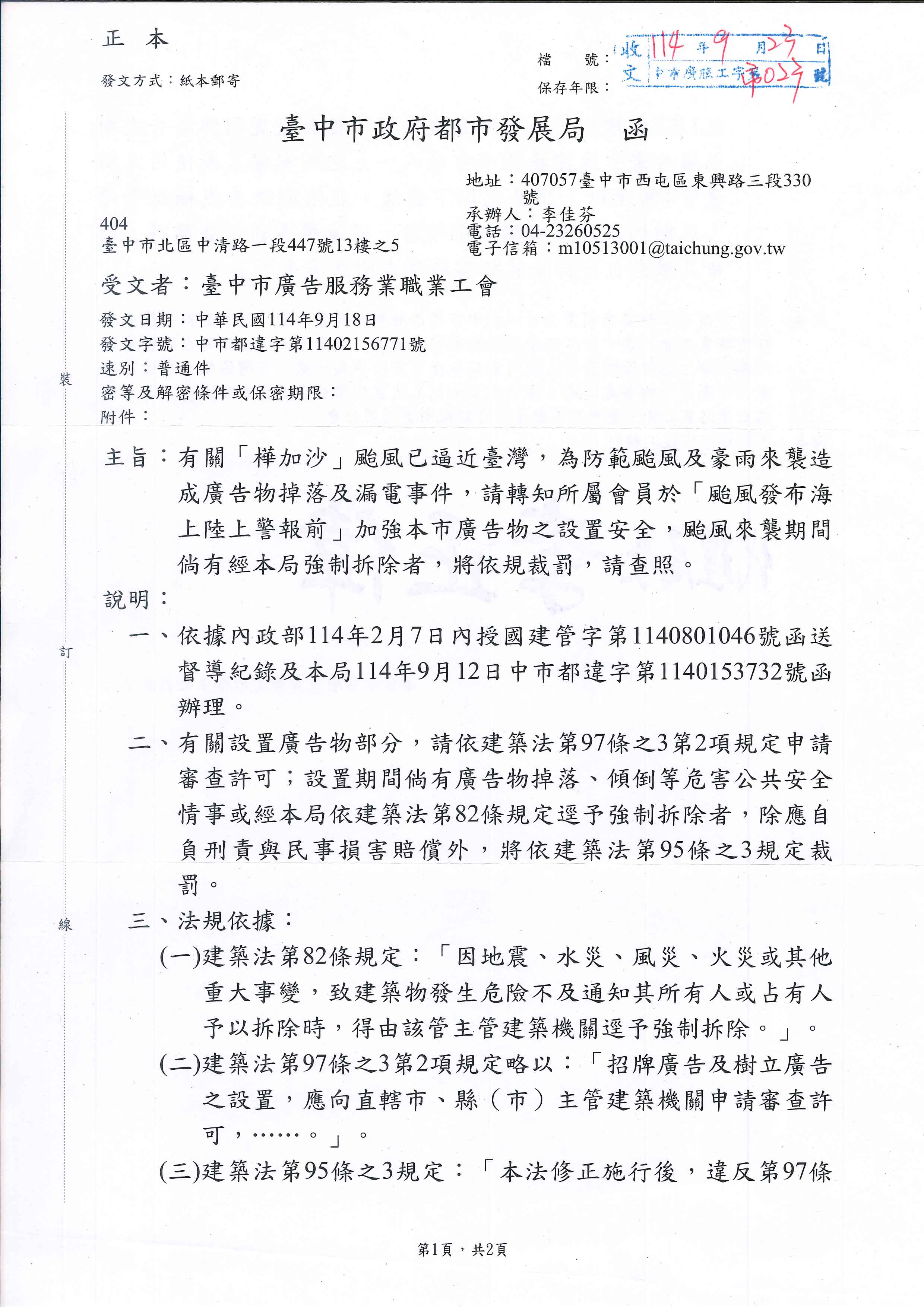 有關「樺加沙」颱風已逼近臺灣,為防範颱風及豪雨來襲造成廣告物掉落及漏電事件,請轉知所屬會員於「颱風發布海上陸上警報前」加強本市廣告物之設置安全,颱風來襲期間倘有經本局強制拆除者,將依規裁罰。